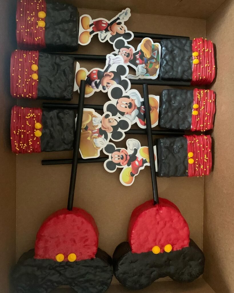 Above them, rows of themed rice crispy treats or similar confections are displayed. Some are dipped in vibrant red with yellow sprinkles, echoing Mickey’s shorts, while others are coated in black, representing his ears. Each treat stick features different Mickey Mouse poses, adding an extra layer of fun and personalization. This collection showcases thoughtful detail in every bite.