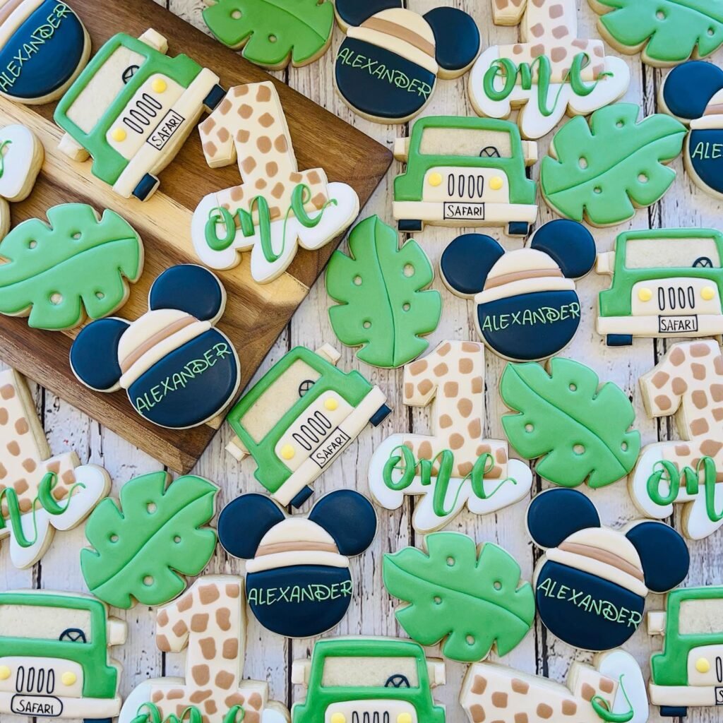 A standout cookie design is the Mickey Mouse head wearing a safari hat, personalized with “ALEXANDER” in a stylish font. This detail makes the treats special for the birthday child. Number “1” cookies with a giraffe print and a green “one” script are also present, signifying a first birthday celebration. The playful combination of themes creates a cohesive and exciting set.