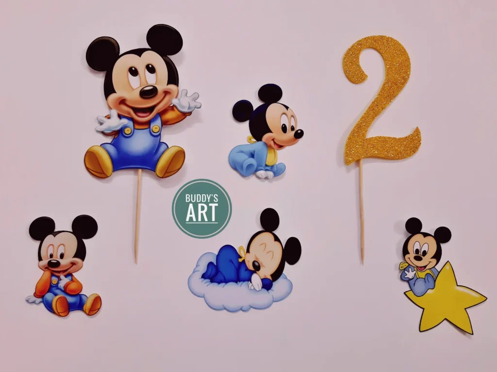 Various Baby Mickey poses are included, adding versatility to the decorations. One cutout shows Baby Mickey happily sitting, while another depicts him peacefully sleeping on a fluffy cloud. These charming illustrations capture the innocence and joy of a baby’s first year. They are perfect for scattering around the party area or using as additional cake or cupcake toppers.