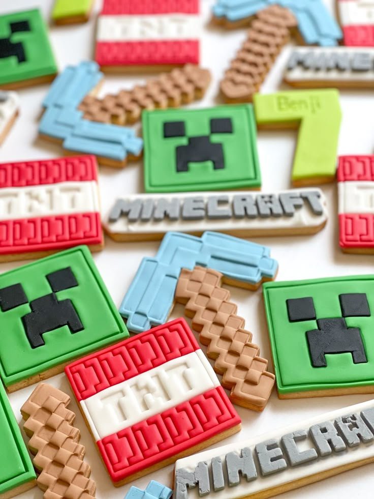The collection also includes cookies shaped and decorated like pixelated pickaxes and shovels, essential tools for any in-game adventure. Some cookies even spell out “Minecraft” in blocky letters, reinforcing the theme. The attention to detail in the royal icing makes these almost too good to eat.