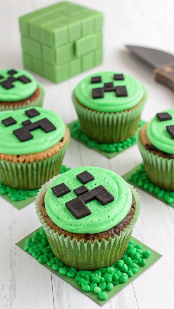 These vibrant green cupcakes are an absolute delight, making them a sensational addition to any minecraft birthday party. Each one is expertly frosted with a smooth, bright green swirl, topped with the iconic pixelated black face of a Creeper. This simple yet effective design instantly brings the game’s famous mob to life.
