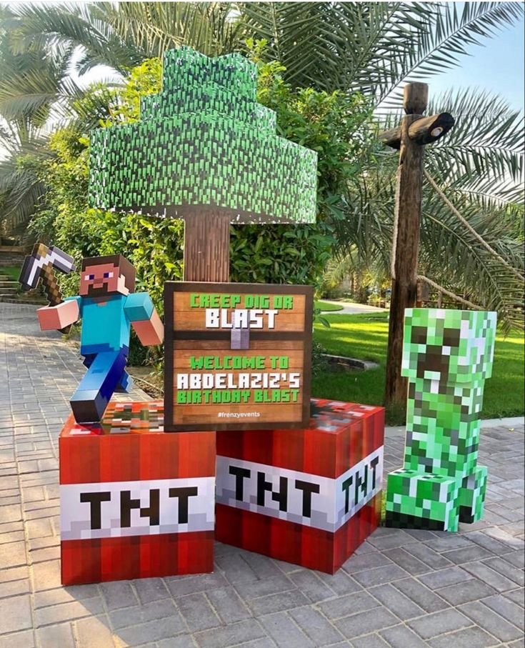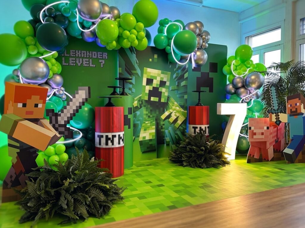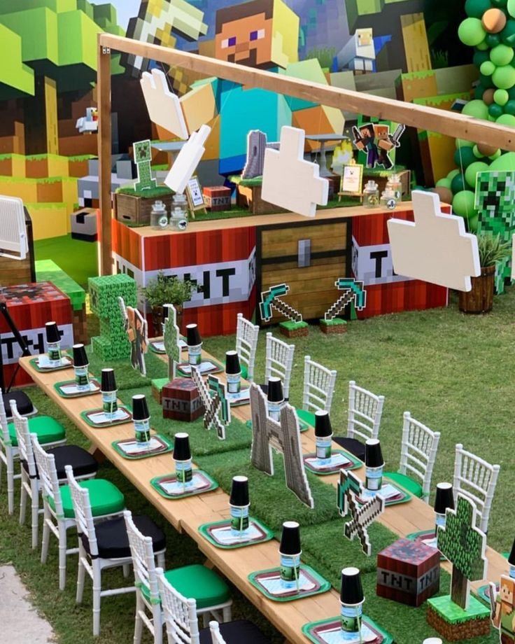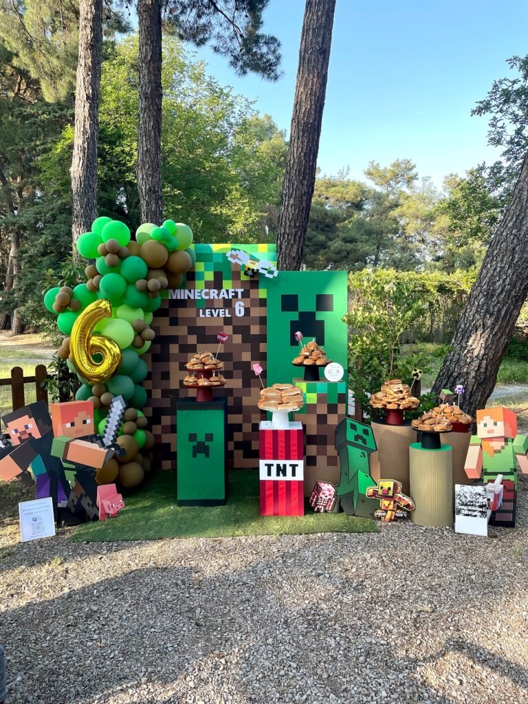 Surrounded by natural greenery, this outdoor setup perfectly blends the digital world of Minecraft with a real-world celebration. It’s a fantastic photo opportunity and a vibrant introduction to a fun-filled minecraft birthday party, promising excitement from the very first step.