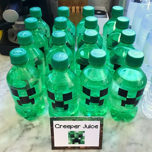 Providing these themed drinks ensures guests stay hydrated while fully enjoying the adventurous atmosphere. These “Creeper Juice” bottles are a simple yet effective touch, enhancing the overall experience of a memorable minecraft birthday party.