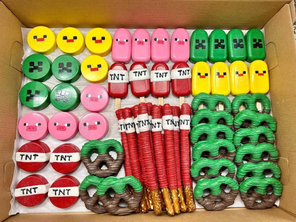 The collection also includes exciting TNT-themed chocolate-covered items, adding a playful explosive touch. Pretzel rods, decorated to look like game tools or perhaps even sticks of TNT, provide a delightful crunch. Chocolate-covered pretzels shaped like grassy blocks further enhance the immersive theme.