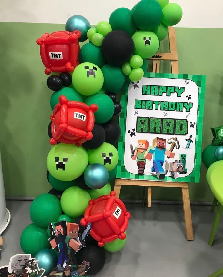 Interspersed throughout the balloon arch are eye-catching red TNT block balloons, adding an exciting, explosive element to the decor. These playful accents enhance the adventurous theme of the game. The varying sizes and shades of green balloons provide visual depth and interest.