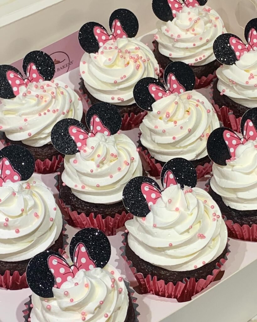 These cupcakes are absolutely adorable and so much fun to look at! Each one is topped with Minnie’s iconic ears and bow, making them perfect individual treats for party guests.