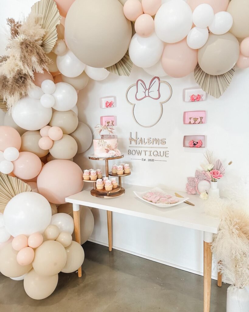 The organic balloon arrangement looks absolutely stunning against that clean backdrop, and those dried flowers add such a trendy touch. It’s amazing how Minnie’s classic silhouette still shines through even with this more subtle color scheme.