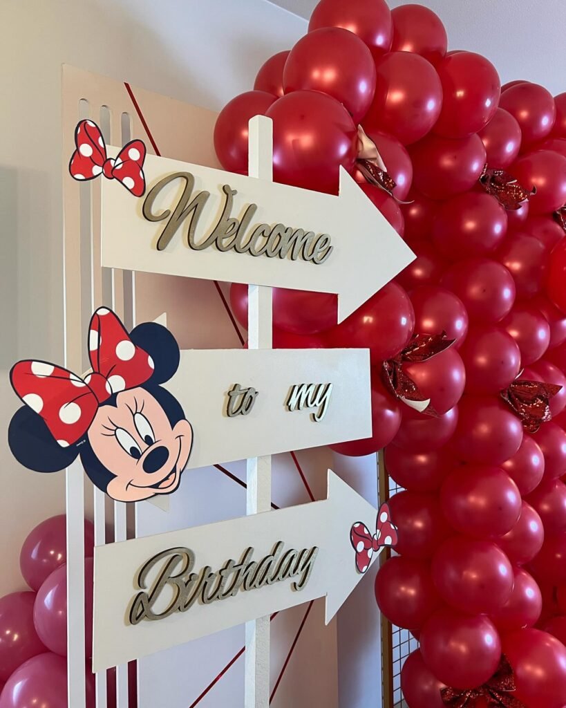 What a delightful way to greet your party guests! This charming setup features a beautiful directional signpost with “Welcome to my Birthday” written in elegant script, adorned with Minnie’s iconic red polka-dot bow.