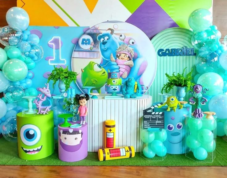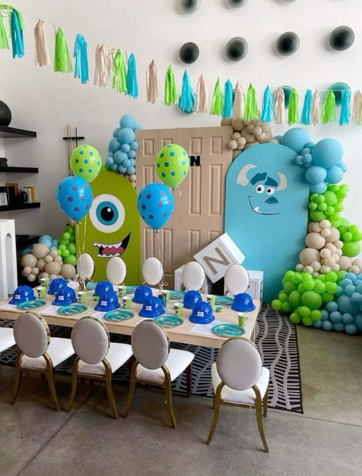 Behind the table, a creative backdrop features two large cutouts resembling iconic Monsters Incorporated characters, complete with expressive faces. Mike Wazowski’s green shape stands proudly, while Sulley’s blue silhouette adds another recognizable figure. Balloon garlands in shades of blue, green, and beige cascade around these cutouts, adding volume and a celebratory feel.