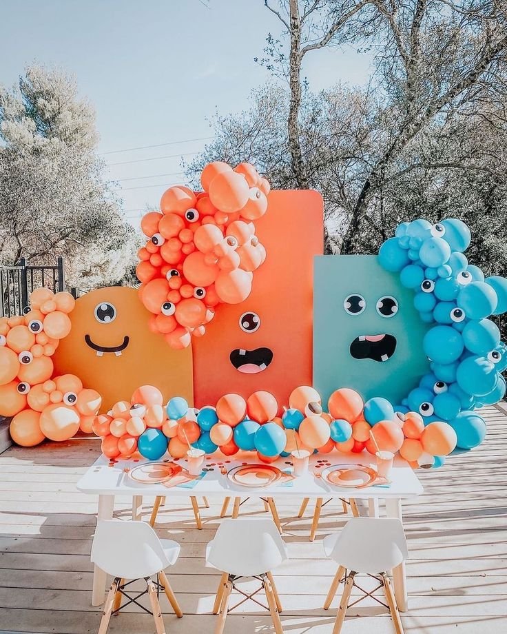 Clusters of balloons in matching shades of orange, blue, and a lighter coral spill from behind and around these monster panels, adding volume and a playful, organic feel. Some of the balloons even have hand-drawn “eyes” on them, enhancing the whimsical monster theme. This clever use of balloons brings the backdrop to life.