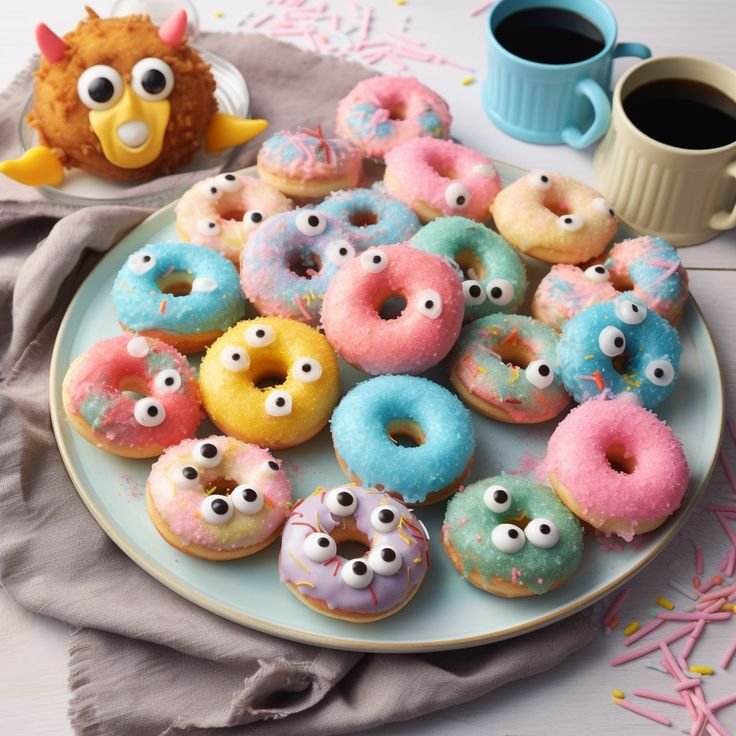 The magic truly happens with the addition of edible googly eyes. Each donut is transformed into a unique little monster, some with one eye, others with two, three, or even more, giving them distinct and charming personalities. This simple detail makes them irresistible and perfectly on-theme for a monster birthday party.