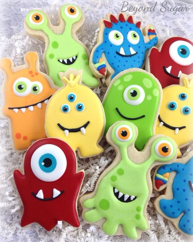Arranged artfully on a bed of white shredded paper, these cookies look like a gathering of friendly creatures, ready to join the monster birthday party fun. They serve as both edible treats and delightful mini-decorations. Offering these colorful characters ensures every guest leaves with a smile and a sweet memory of the celebration.