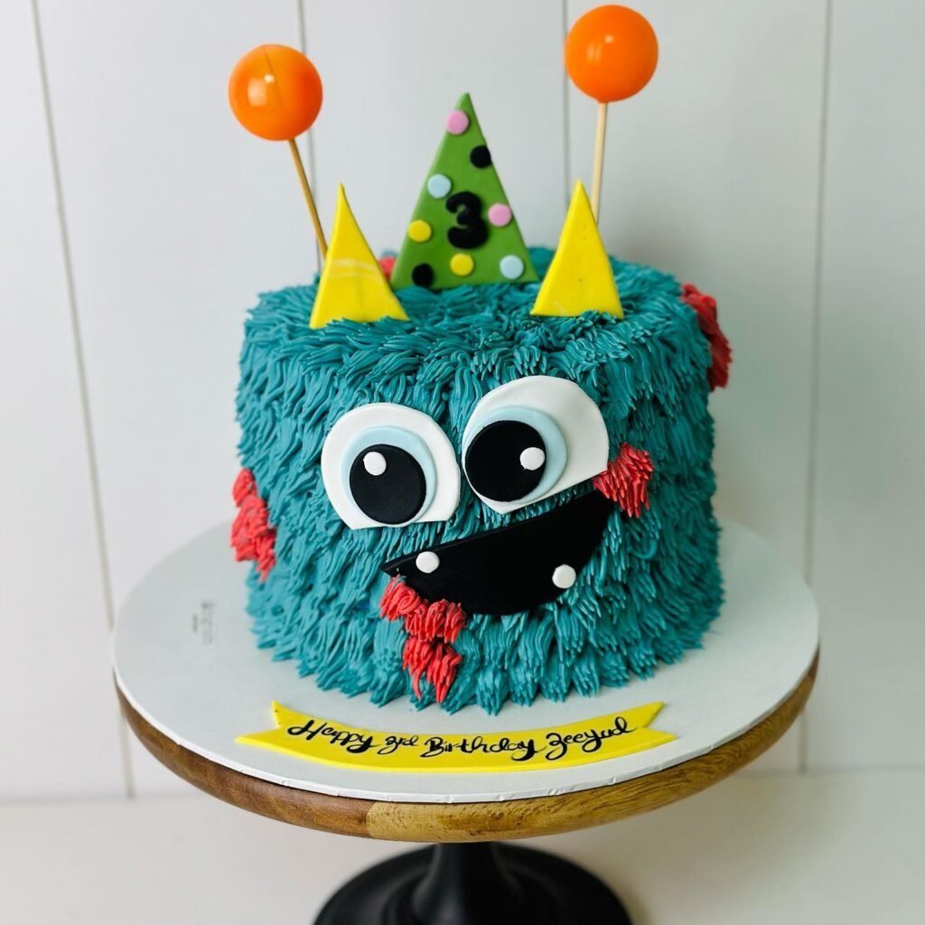 This adorable cake is an absolute showstopper, making it a centerpiece for any monster birthday party. Its teal blue “fur” is expertly piped, creating a fun, textured look that begs to be touched. Large, expressive eyes and a wide, goofy smile give this monster a truly friendly personality, sure to delight children and adults alike.