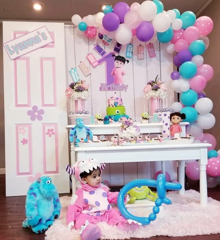 A vibrant balloon arch in shades of purple, pink, white, and teal cascades around the backdrop, which features Boo from Monsters, Inc. The number “1” proudly announces the first birthday milestone. Underneath, a delightful two-tiered cake mirrors the colors of the balloons, adding to the festive atmosphere.