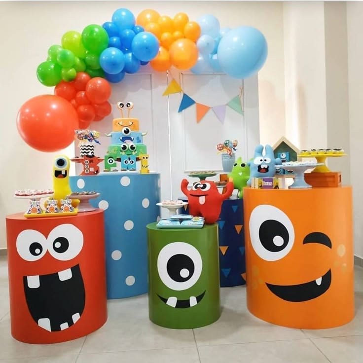 The true stars of this monster birthday party are the custom cylindrical pedestals, each designed to look like an adorable monster face. One red monster grins wide, ready to greet everyone, while a green one sports a curious single eye. A winking orange monster adds a playful touch. These unique bases not only provide a fantastic surface for treats but also serve as charming characters themselves.