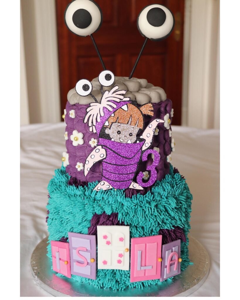 A glittering cutout of Boo in her monster costume, complete with the number “3,” stands proudly on the cake, celebrating the special age. The base also spells out “ISLA” with charming door-like letters, personalizing the cake. This Monsters Inc birthday cake is truly a work of art.