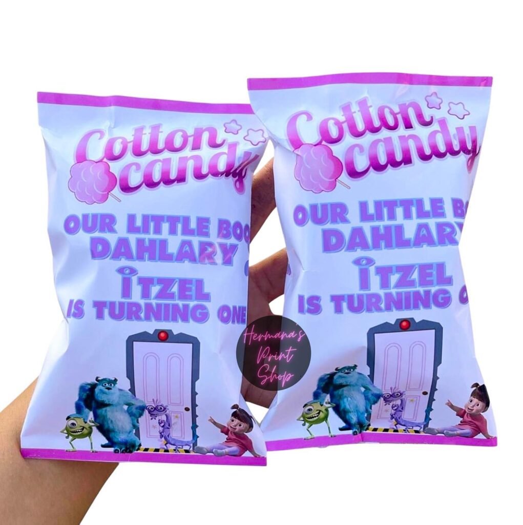 Offer a delightful and sugary treat to your guests with these customized cotton candy bags, a charming idea for any Monsters Inc birthday party. Each bag features a playful design with the words “Cotton Candy” in a fun, whimsical font.