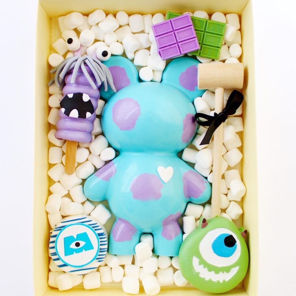 This “breakable” treat is nestled among a bed of fluffy white mini marshmallows. The box also contains an assortment of other fun Monsters Inc themed goodies: a purple monster-themed cake pop with googly eyes, a grinning green Mike Wazowski chocolate, and a round cookie featuring the Monsters Inc logo.