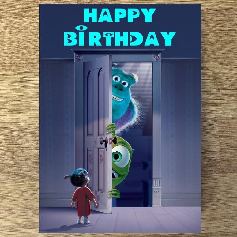 This beloved imagery captures the essence of their unique friendship and the magic of the film. The classic Monsters Inc door, slightly ajar, adds a touch of suspense and fun to the design. Bold, bright blue text at the top simply states “HAPPY BIRTHDAY,” making the card universally appealing for a birthday celebration.