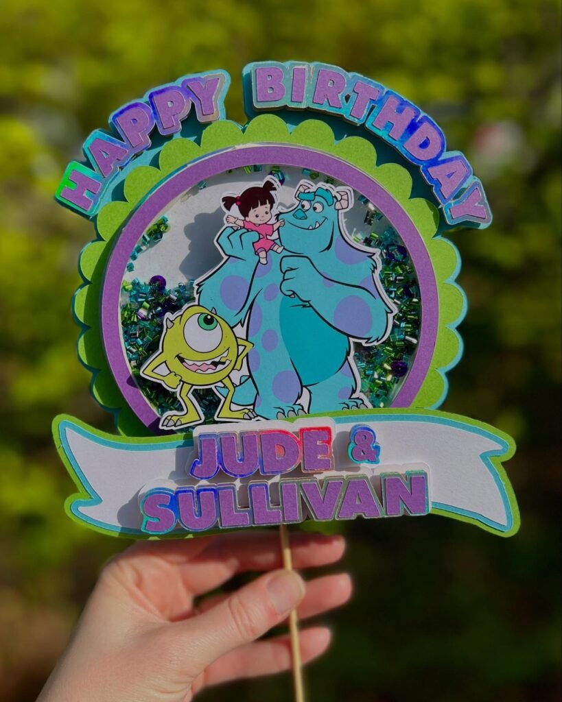 Below, a personalized banner proudly displays “Jude & Sullivan,” making this topper unique for a combined celebration or a special name. This intricate and colorful topper is sure to be a highlight of your Monsters Inc birthday party, creating a memorable focal point for your cake.
