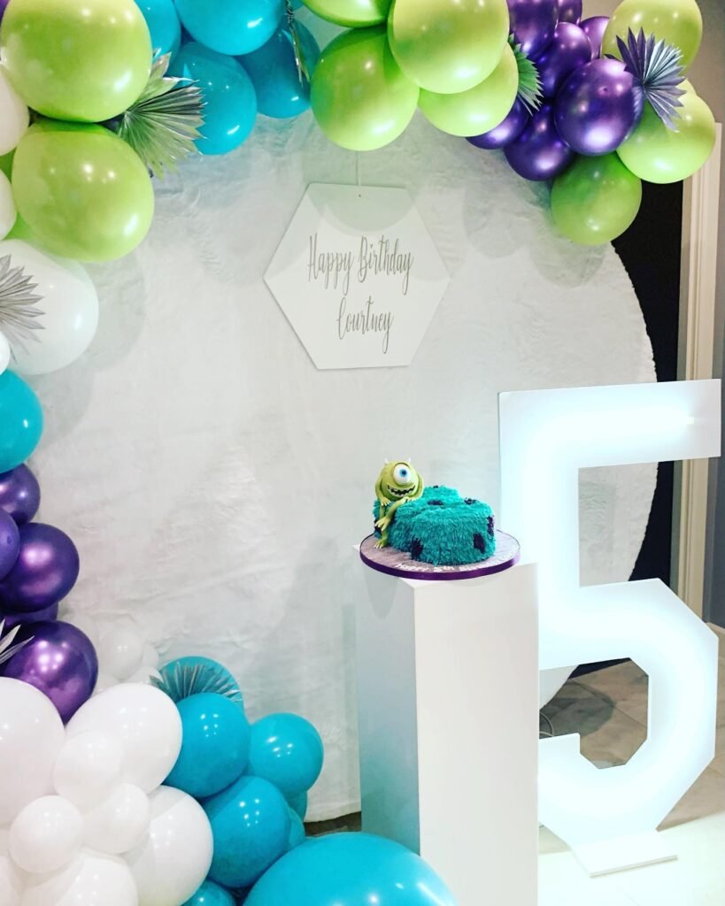 A large, illuminated number “5” stands beside it, proudly showcasing the birthday age. This elegant arrangement combines fun Monsters Inc elements with a modern aesthetic, making it an impressive display for any Monsters Inc birthday party.