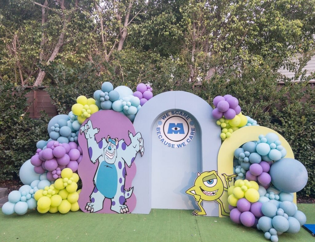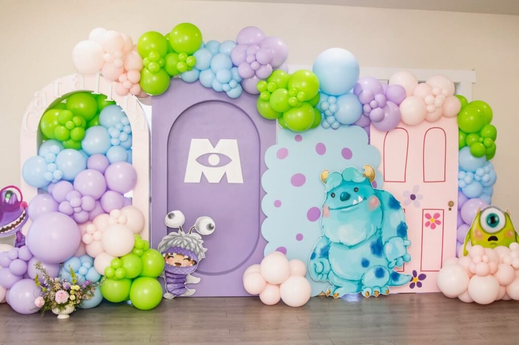 The balloons vary in size, adding dynamic texture and visual interest to the display. Behind the balloons, a striking backdrop features beloved Monsters Inc characters peeking out from behind a blue monster door, as if inviting everyone into their world.