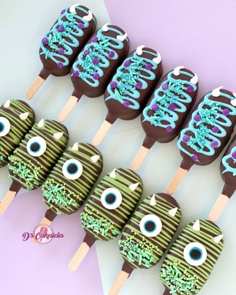 Offer a unique and delicious treat with these charming Monsters Inc cakesicles, a creative addition to any Monsters Inc birthday party. Each cakesicle is shaped like a mini ice cream bar and dipped in rich chocolate.