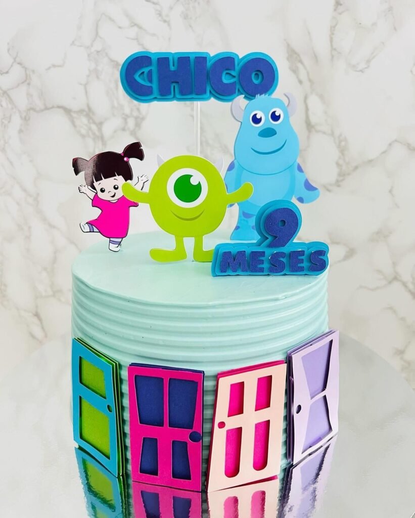 The cake also features a personalized “Chico” topper and “9 Meses” in bold lettering, celebrating a special milestone. This Monsters Inc birthday cake is a delightful centerpiece, combining beloved characters with memorable film elements for a truly special celebration.