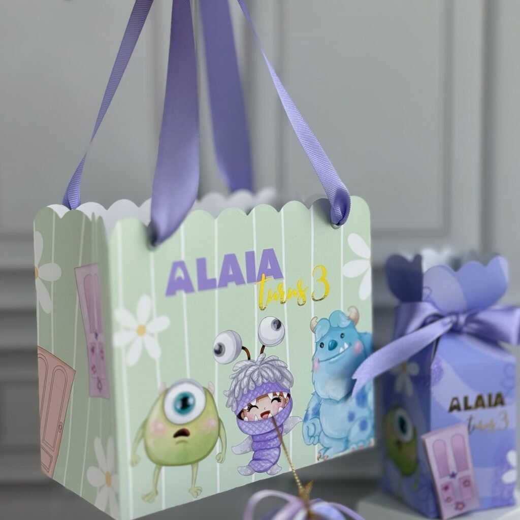 Beloved characters like Mike Wazowski, Boo, and Sulley are front and center, ready to delight young partygoers. The bags are customized with “Alaia turns 3,” making each one a special memento of the celebration.
