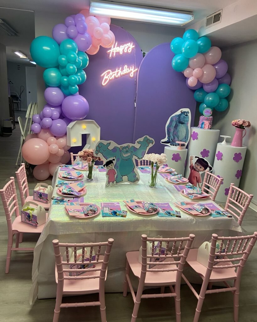 Adorable Monsters Inc themed plates and napkins featuring Sulley and Boo adorn each place setting, adding a personalized touch. In the background, a striking purple arch with a “Happy Birthday” neon sign creates a festive focal point. Vibrant balloon garlands in shades of teal, purple, and pink frame the arches, adding to the celebratory atmosphere.