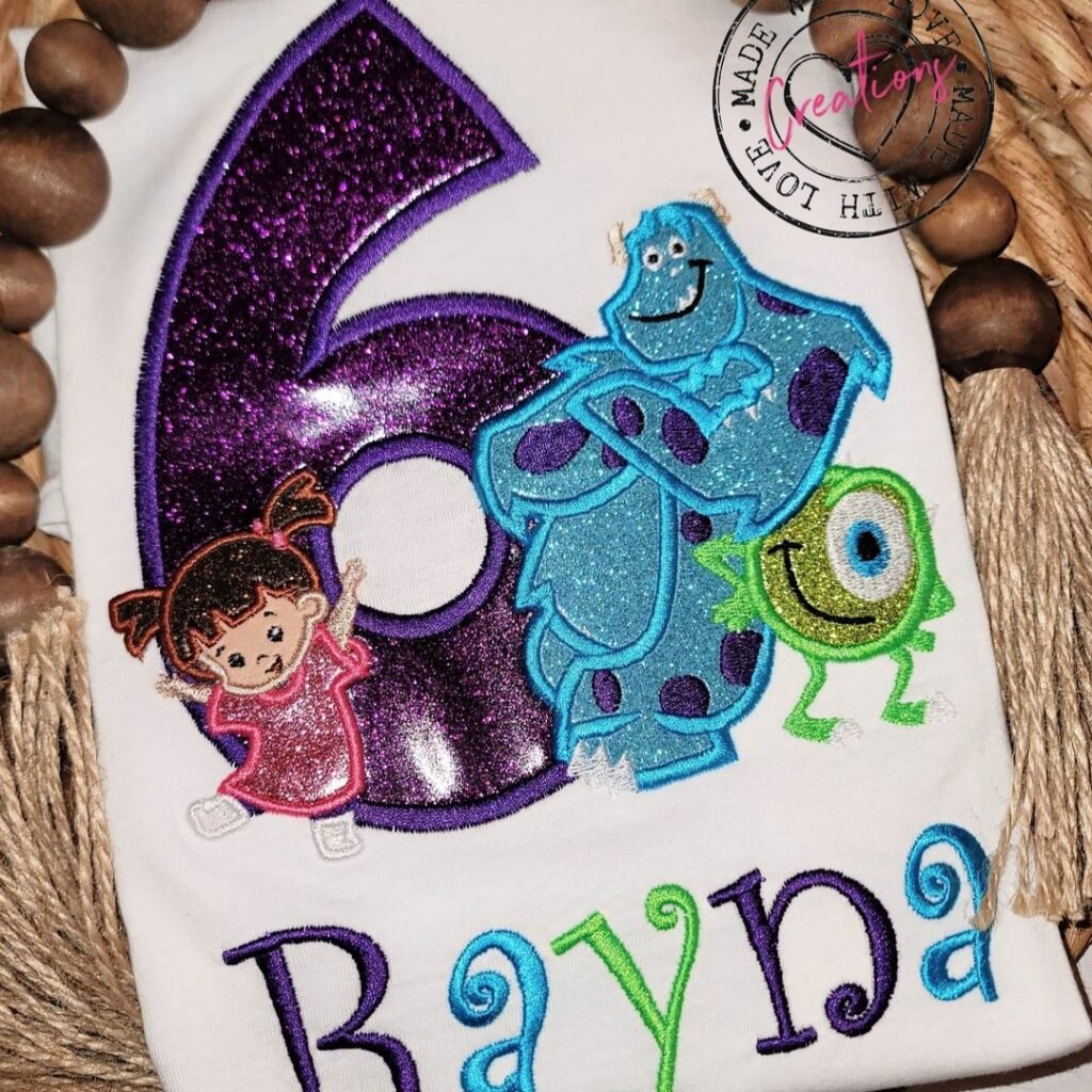 Dress the birthday child in style with this adorable personalized Monsters Inc birthday shirt. This custom shirt features beloved characters Boo, Sulley, and Mike Wazowski, all ready to celebrate.