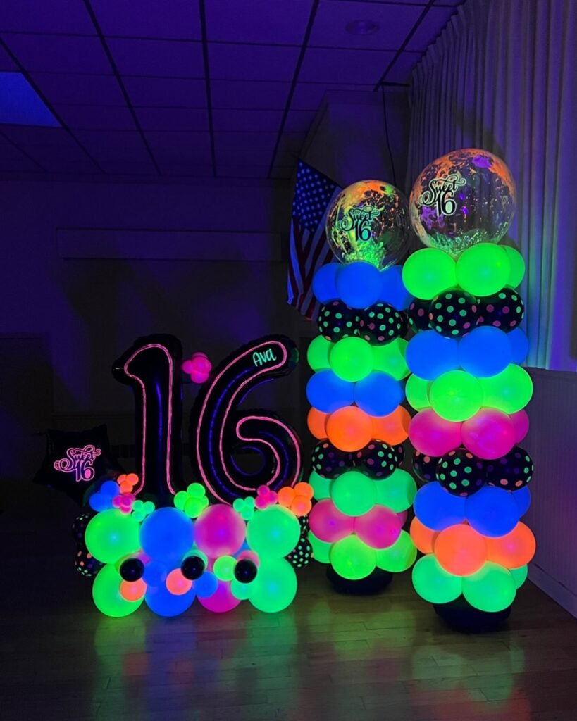 This towering balloon installation is pure party architecture! The number 16 stands proud while those glow-in-the-dark balloons create layers of color that build excitement.