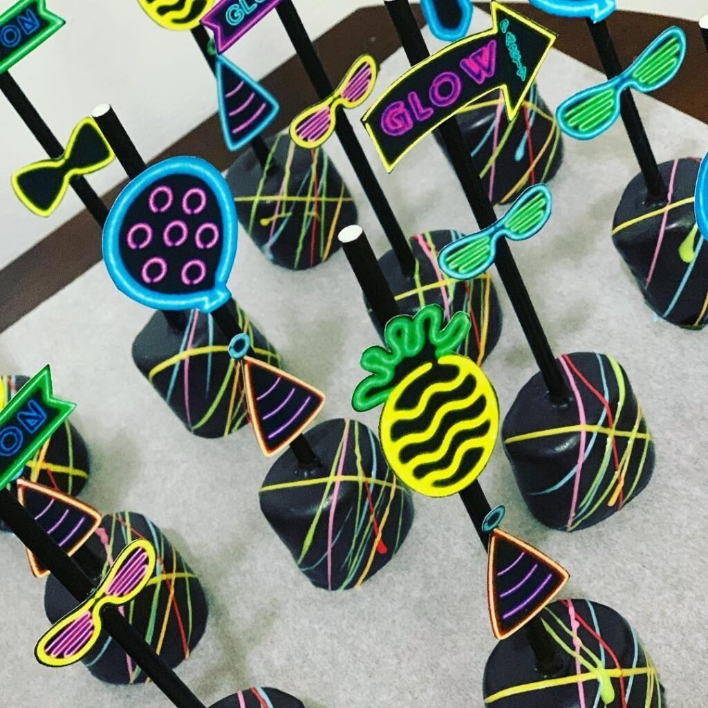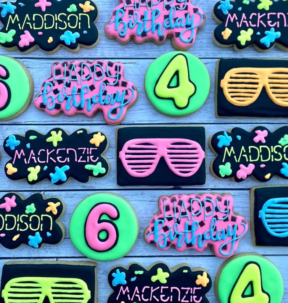 These neon glow cookies are absolutely everything! Each one is like a tiny work of art with those perfect bright colors and personalized names. The shutter shades and “Happy Birthday” designs capture that retro-meets-modern vibe perfectly.