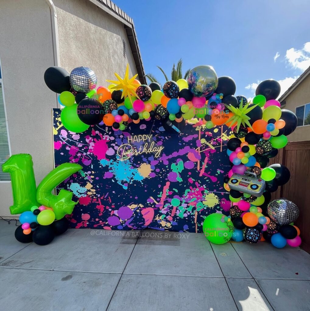 Tessa’s celebration is giving us major festival vibes with this incredible setup! The rainbow balloon arch creates the perfect entrance while that black backdrop with neon doodles screams creativity.