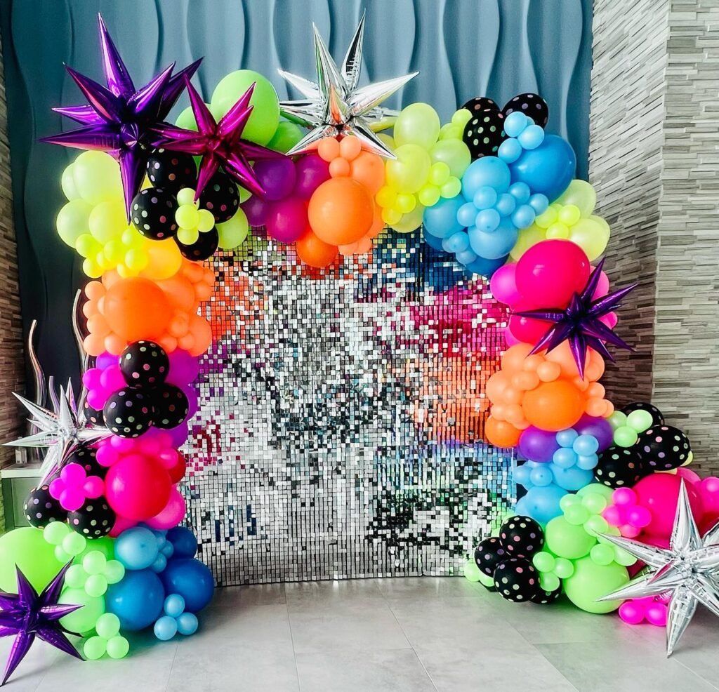 This backdrop is what party dreams are made of! Hundreds of balloons in every possible neon shade create a wall of pure celebration energy.