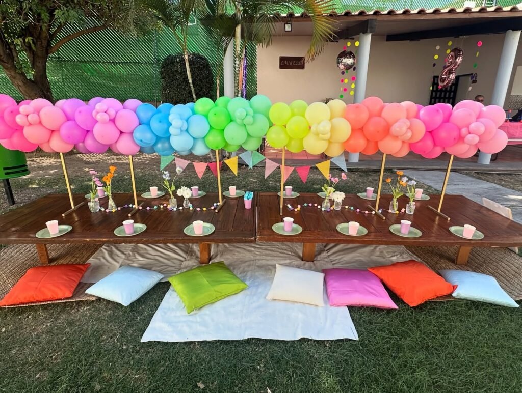 The balloon arch steals the show, flowing from hot pink through electric blues, vibrant greens, sunny yellows, and back to coral pinks.
