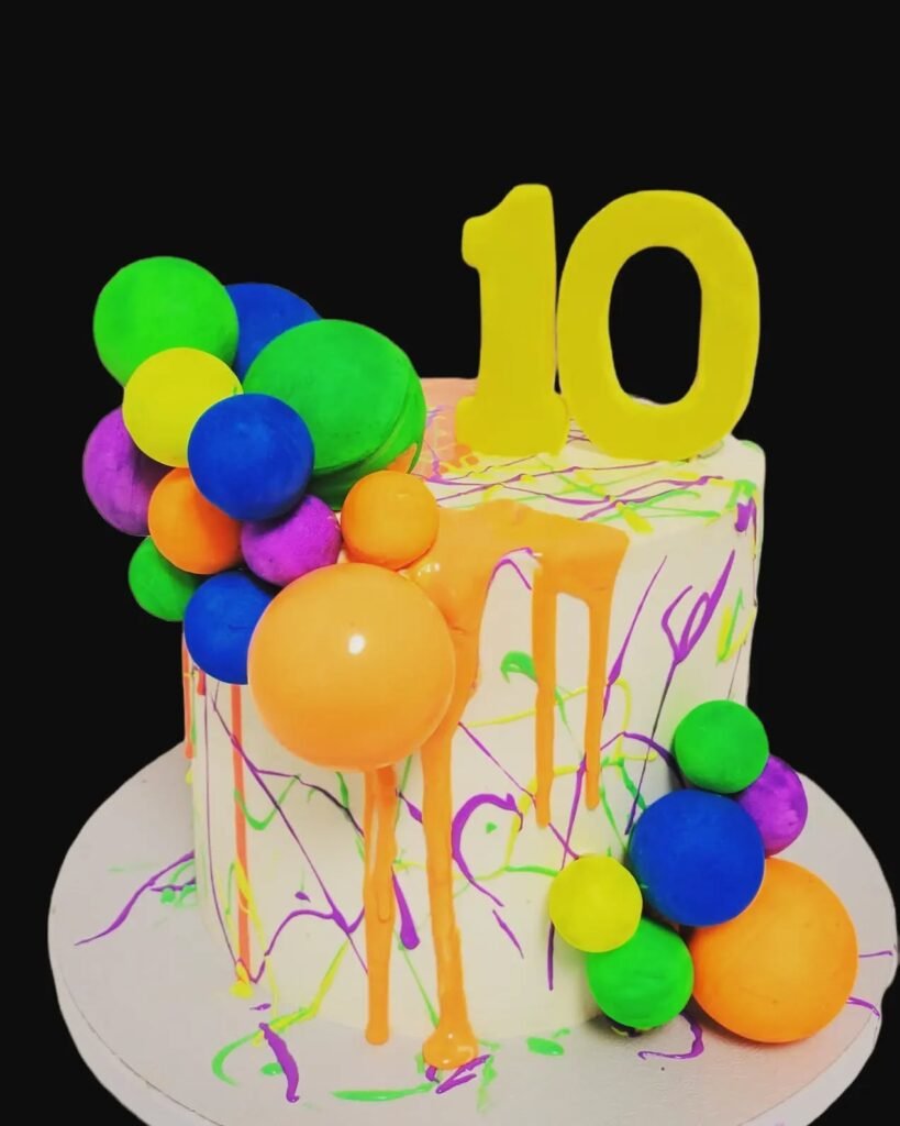 This cake is pure edible art! Dripping with neon orange frosting and decorated with perfectly round rainbow spheres, it’s like someone threw the most beautiful paint party ever.