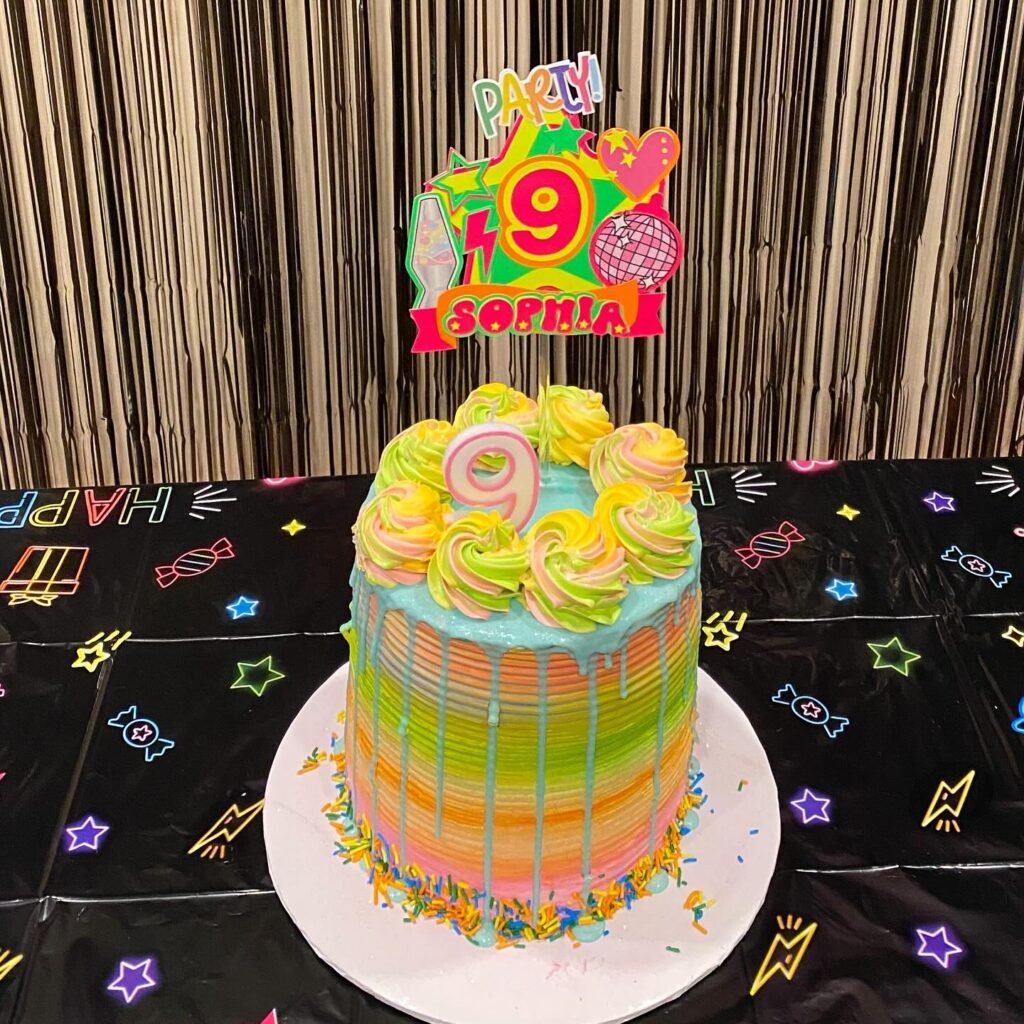 Sophia’s 9th birthday cake is bringing serious disco energy with that incredible rainbow drip design!