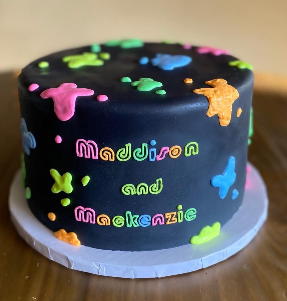 Dyllan’s Sweet 16 cake game is absolutely next level! This three-tier masterpiece glows under blacklight, making every neon detail pop like crazy.