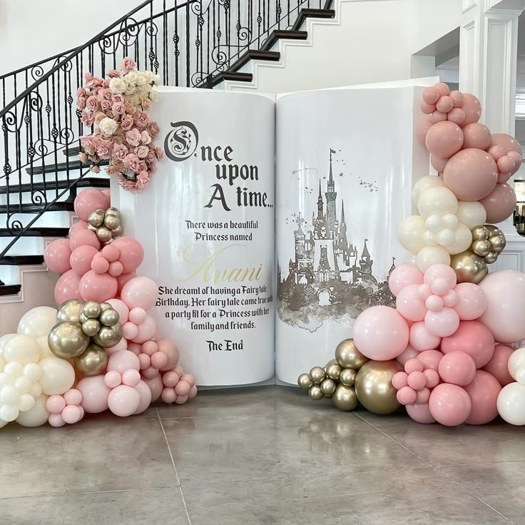 Lush organic balloon garlands in shades of soft pink, cream, and shimmering gold frame the storybook, adding a touch of fairytale magic and celebration. Delicate floral accents in coordinating pinks enhance the enchanting scene. This display is designed to captivate and inspire.