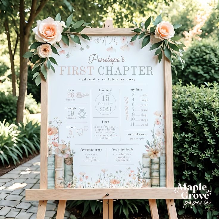 This beautiful milestone board is a heartwarming addition to any “One for the Books” first birthday celebration. Titled “Penelope’s First Chapter,” it elegantly chronicles the baby’s growth and achievements. Key details like height, weight, first words, and favorite foods are presented in a charming, easy-to-read format.