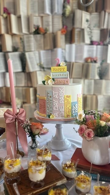 The cake stands proudly against a stunning backdrop of open books, creating an immersive literary atmosphere. Surrounding the cake, individual dessert cups and vibrant floral arrangements enhance the festive spread. A tall, elegant candle with a pink bow completes the enchanting scene.
