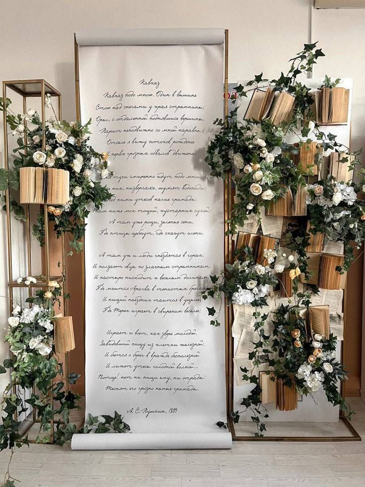 This magnificent display transforms a space into a truly “One for the Books” literary haven. A large scroll featuring beautiful script, likely a classic poem or passage, anchors the left side, inviting contemplation. On the right, a vertical arrangement of open books, intertwined with lush green ivy and delicate white and cream flowers, creates a stunning visual.
