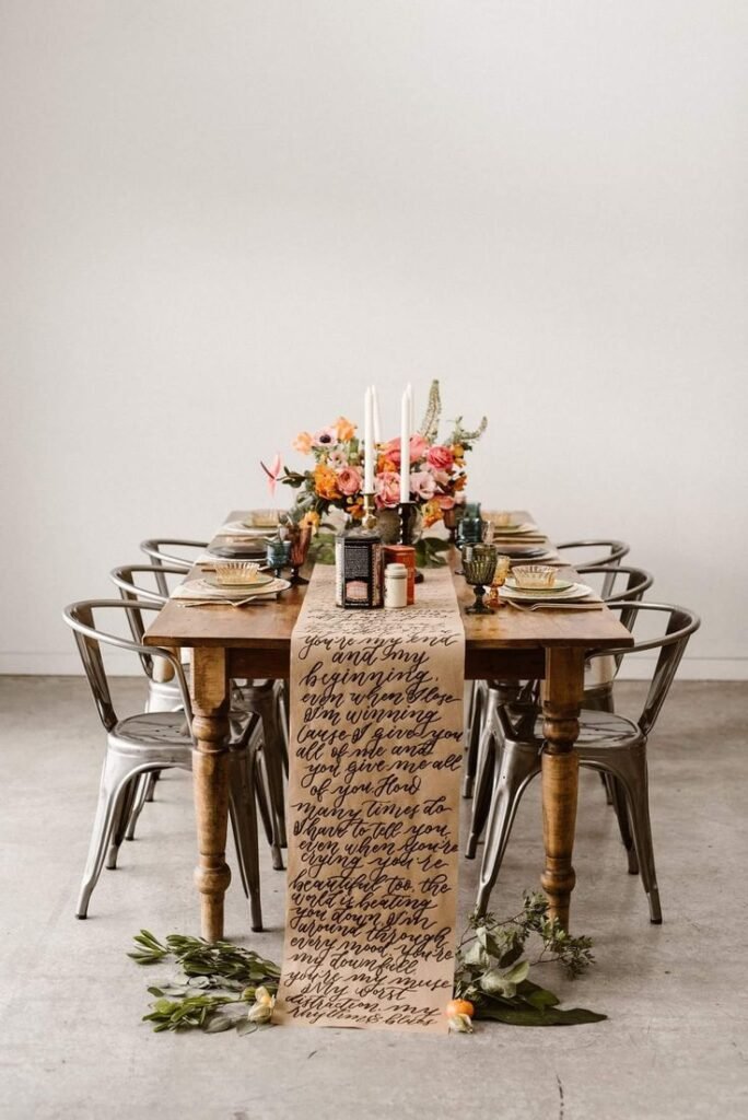 This inspiring table runner transforms a gathering into a “One for the Books” literary experience. Crafted from a roll of paper featuring elegant handwritten script, it cascades beautifully down the table, creating a unique and intimate atmosphere. The personalized text, perhaps a favorite poem or song lyrics, adds a deeply personal touch to the decor.