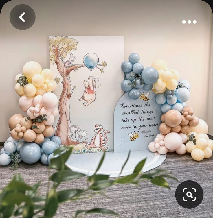 The color palette is gentle and inviting, perfect for a baby shower or a child’s birthday celebration. This setup offers a beautiful backdrop for capturing precious memories. Guests will adore posing with these classic characters and heartwarming sentiments.