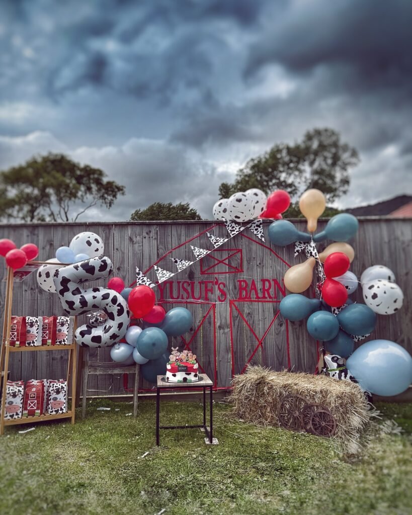 Transform your backyard into a delightful farmyard adventure with this rustic barn-themed celebration. The weathered wooden fence backdrop creates an authentic countryside atmosphere, while the dramatic balloon arch in cow print, blues, and reds brings the farm theme to life. Hay bales scattered around the space provide natural seating and photo opportunities that kids absolutely love.