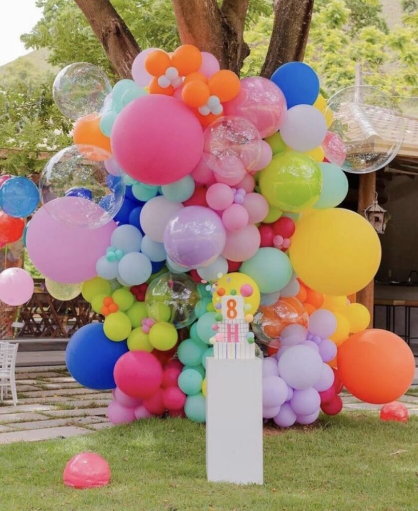 Setting up this outdoor birthday party idea requires strategic planning but delivers maximum impact. The balloons cluster around existing trees or structures, making use of natural anchor points in your space. A simple white pedestal holds the birthday cake, allowing it to shine against the colorful backdrop without competing for attention.