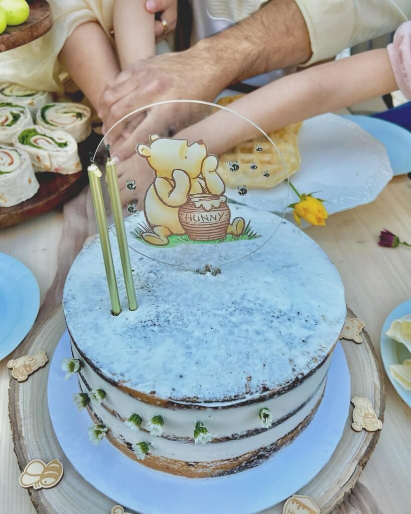 This enchanting Winnie the Pooh cake brings beloved childhood memories to life in your outdoor celebration. The semi-naked frosting technique creates a rustic, homemade charm that fits beautifully with garden party aesthetics. Fresh daisies tucked between the layers add natural elegance, while the adorable Pooh bear cake topper featuring our favorite honey-loving character becomes an instant conversation starter.