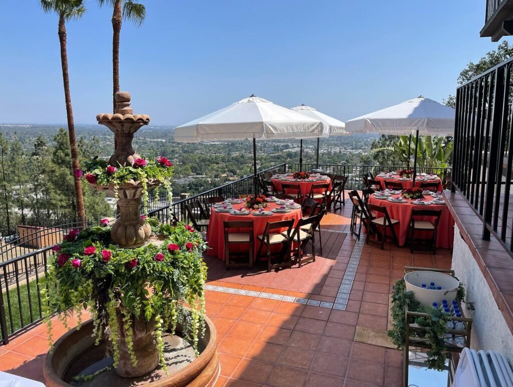 This breathtaking terrace setup showcases how elevation can transform outdoor birthday party ideas into unforgettable experiences. The panoramic valley views create a stunning natural backdrop that no indoor venue can match. Crisp white umbrellas provide essential shade while maintaining an elegant aesthetic, and the warm coral tablecloths add a pop of color that complements the Mediterranean-style setting beautifully.