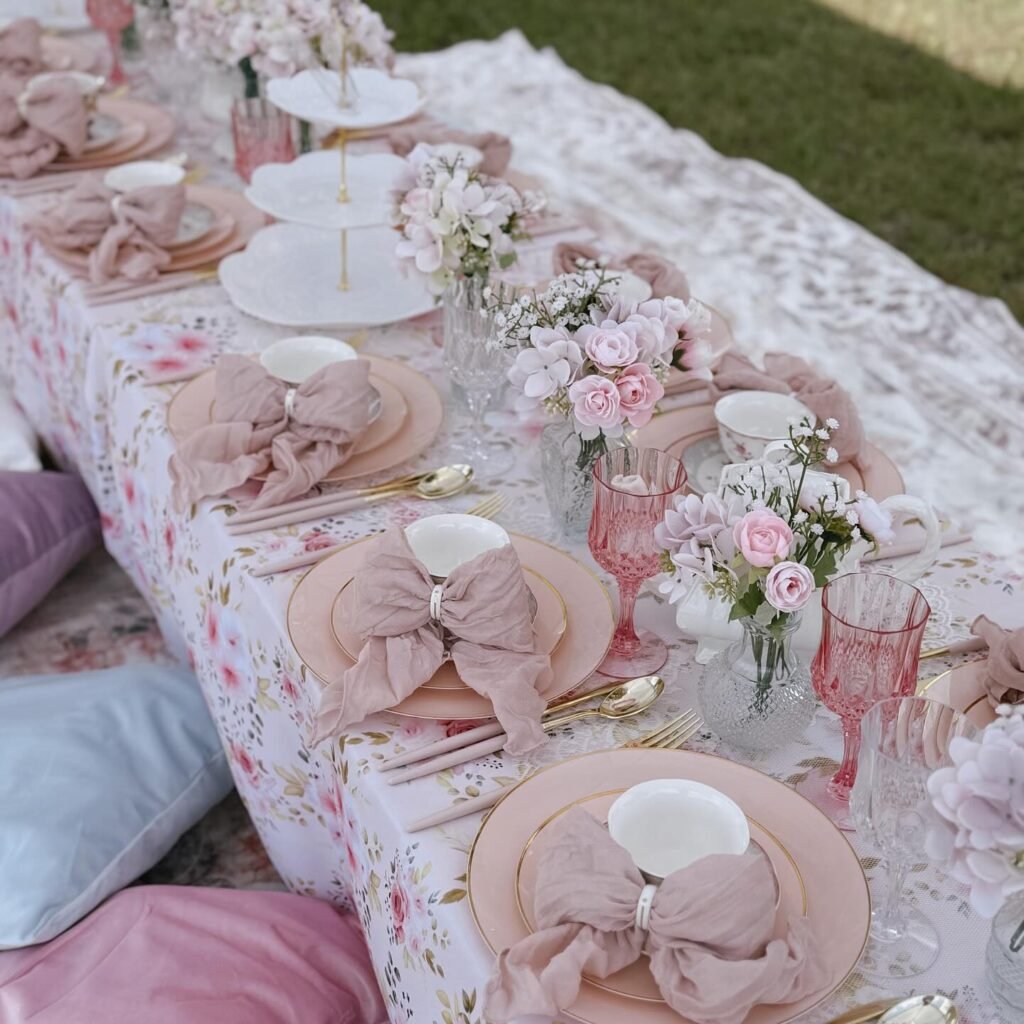 This dreamy blush and pink tablescape elevates outdoor birthday party ideas to pure elegance. Delicate floral linens create a garden party foundation, while soft pink chargers and gold-rimmed plates add sophisticated layers. The gorgeous fabric napkins tied with silk ribbons become beautiful keepsakes that guests can take home as party favors.
